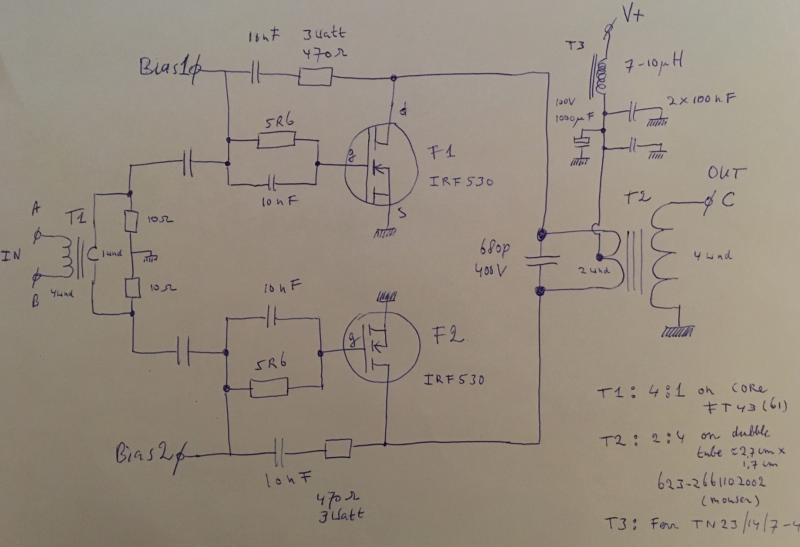 After looking at a lot of schemes, I came up with the following scheme. The input transformer makes sure that we drive the FETs with a very low impedance, which is good for stability. We probably have to experiment with the transformer to get the best results. Furthermore we use some proposals to create some feed back via the 10nF, 470 ohms network. Also for stability and linearity (which we don't need for class E, by the way. Later more about that). The network before the gate is also for stability. Nothing worse than spontaneous resonances. The Capacitor which I forgot to give a value in the scheme is by the way 100nF. Make sure the Capacitor at the end stage is 680pF 400V. It swings to quite some voltages over there. Later we will measure it to get familiar with these high voltages. The output transformer is adapting the low impedance at the drains of the FETs to an acceptable impedance at the output, which should be as close to 50ohm. We will probably need to experiment a bit with the transformer, because I read somewhere that the output impedance of the FETs is dependent on the drain DC voltage. Also the output transformer will greatly determine the efficiency of the amp.